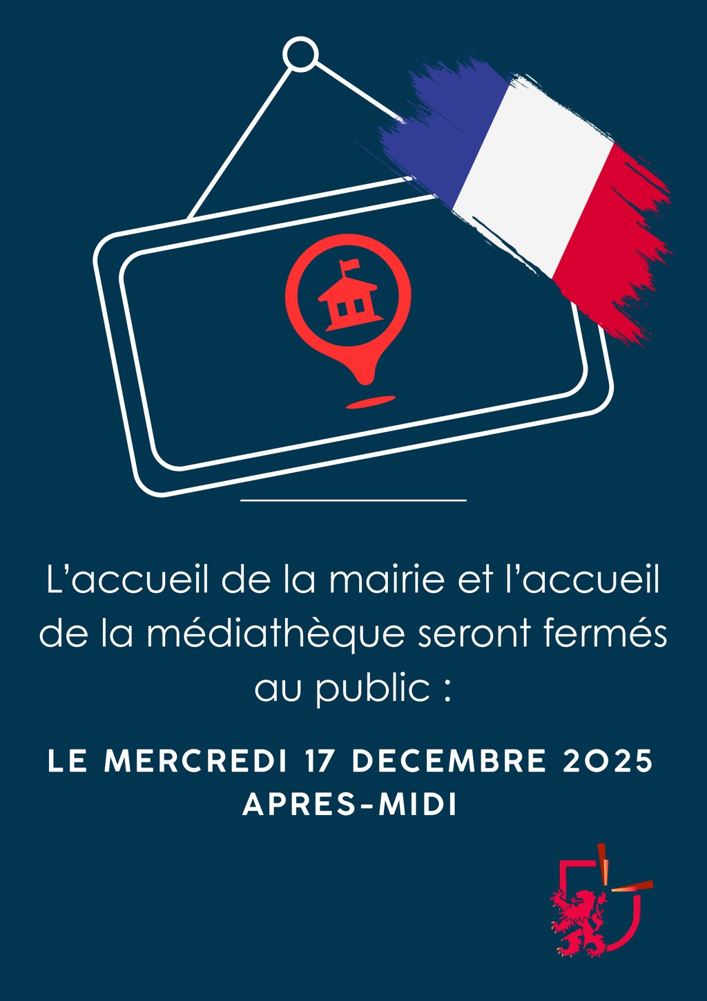 L'acceuil de la mairie et l'accueil de la médiathèque seront fermés au public le mercredi 17 décembre 2025 l'après midi.