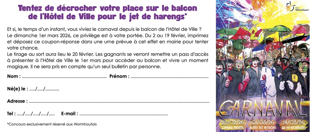 Un pass dâaccĂšs au balcon de lâHĂŽtel de Ville pour le dimanche 1er mars 2026, afin de vivre le jet de harengs au plus prĂšs de lâambiance carnavalesque !