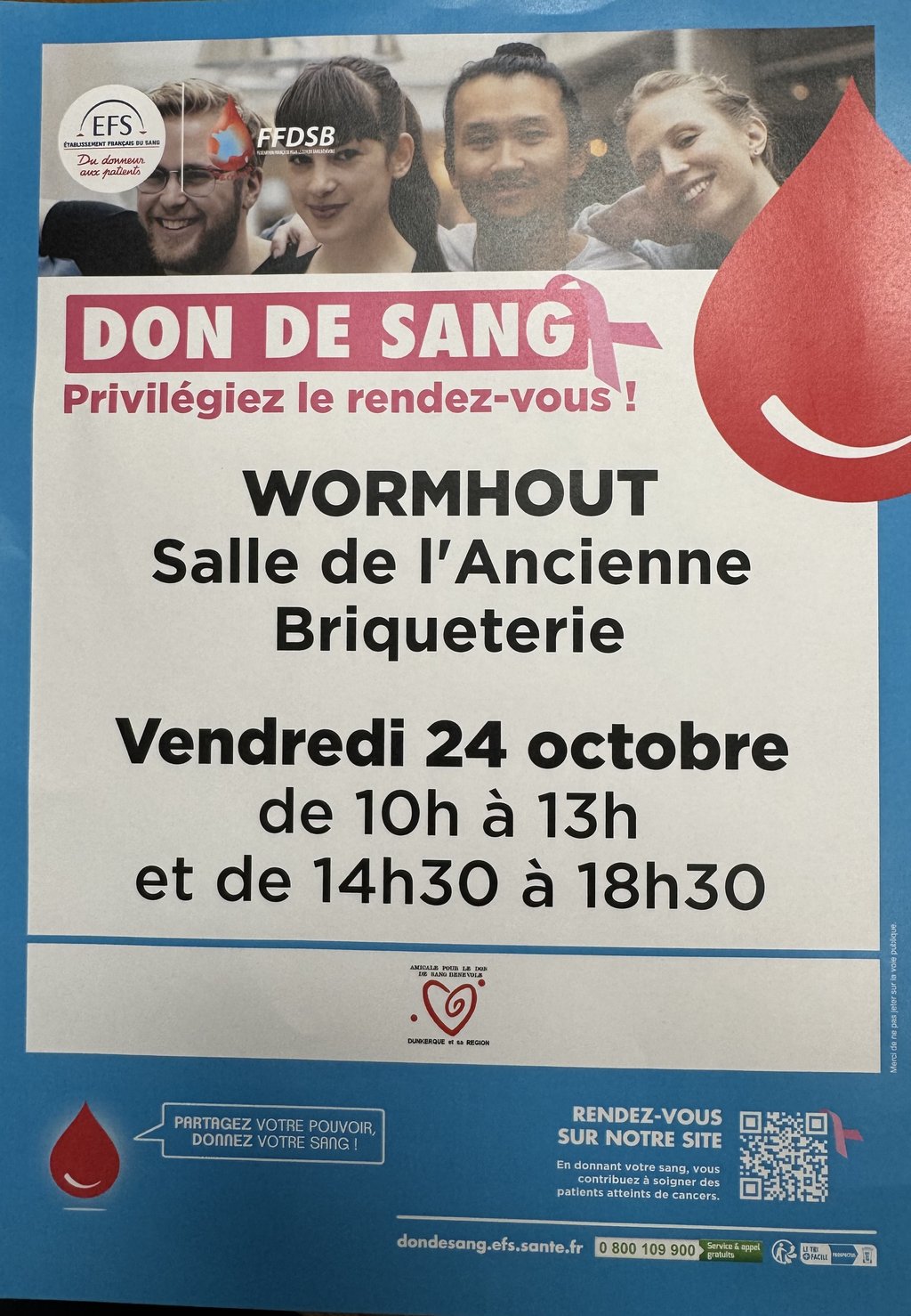 L’Établissement Français du Sang organise une collecte le vendredi 24 octobre à la Salle de l’Ancienne Briqueterie à Wormhout.