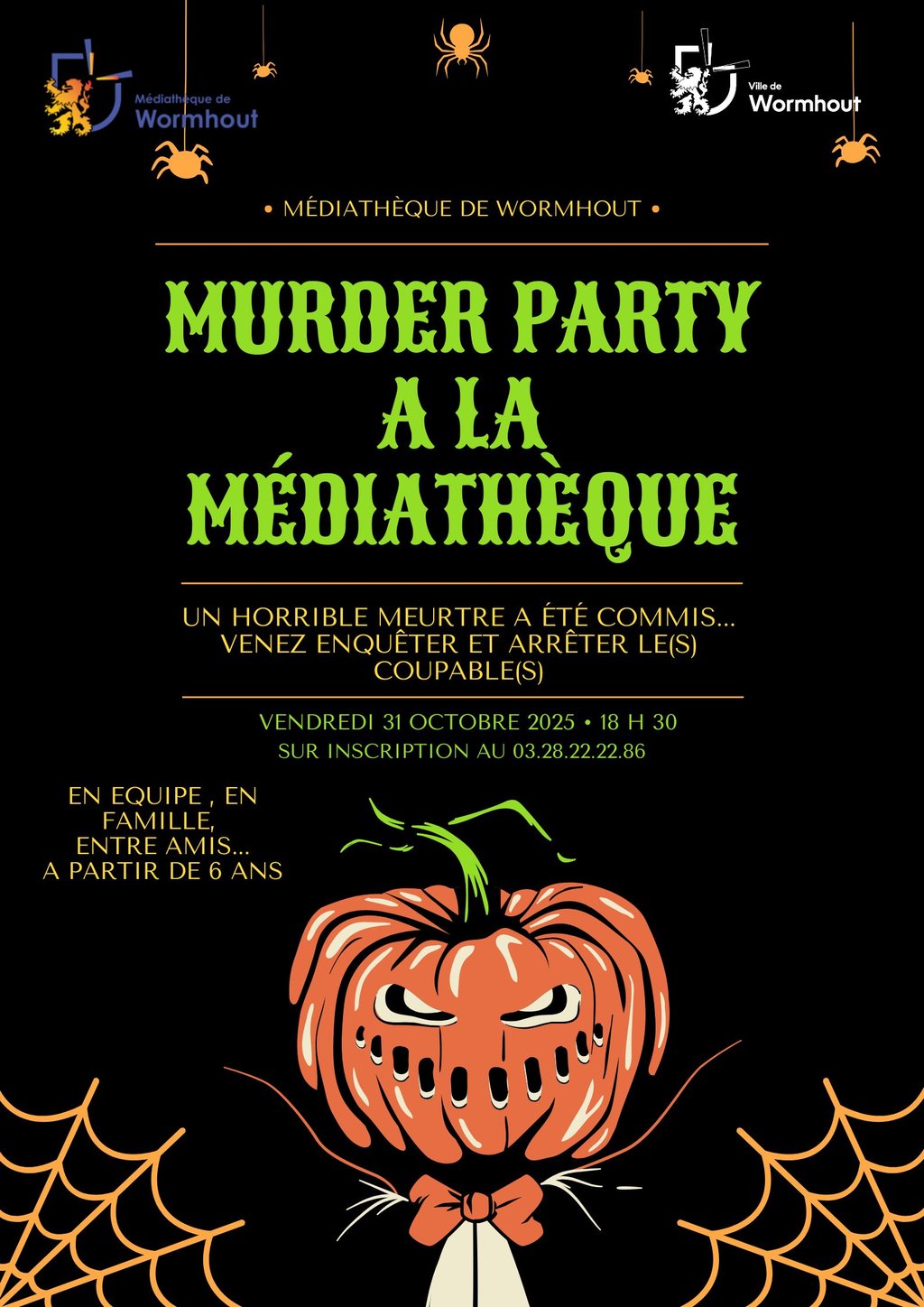 Pendant la préparation des décorations d'halloween, un horrible meurtre a été commis à la Médiathèque... Nous avons besoin de votre aide pour découvrir le meurtrier. Venez enquêter en équipe, en famille ou entre amis... et arrêter le coupable.