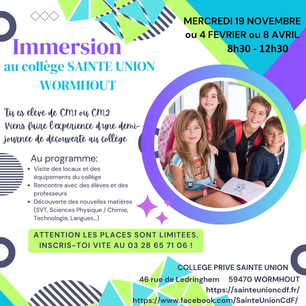 Le collège Sainte Union accueillera les élèves de CM1 et CM2 des écoles publiques pour une demi-journée d'immersion le MERCREDI 19 NOVEMBRE, 4 FEVRIER, 8 AVRIL de 8h30 à 12h30.