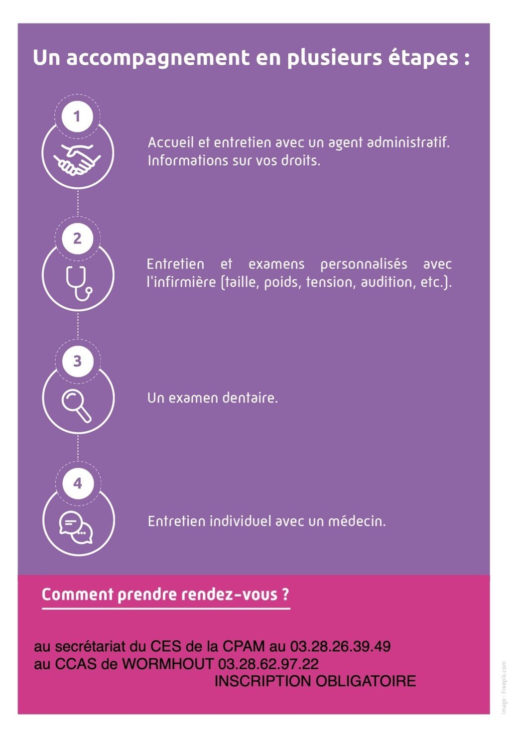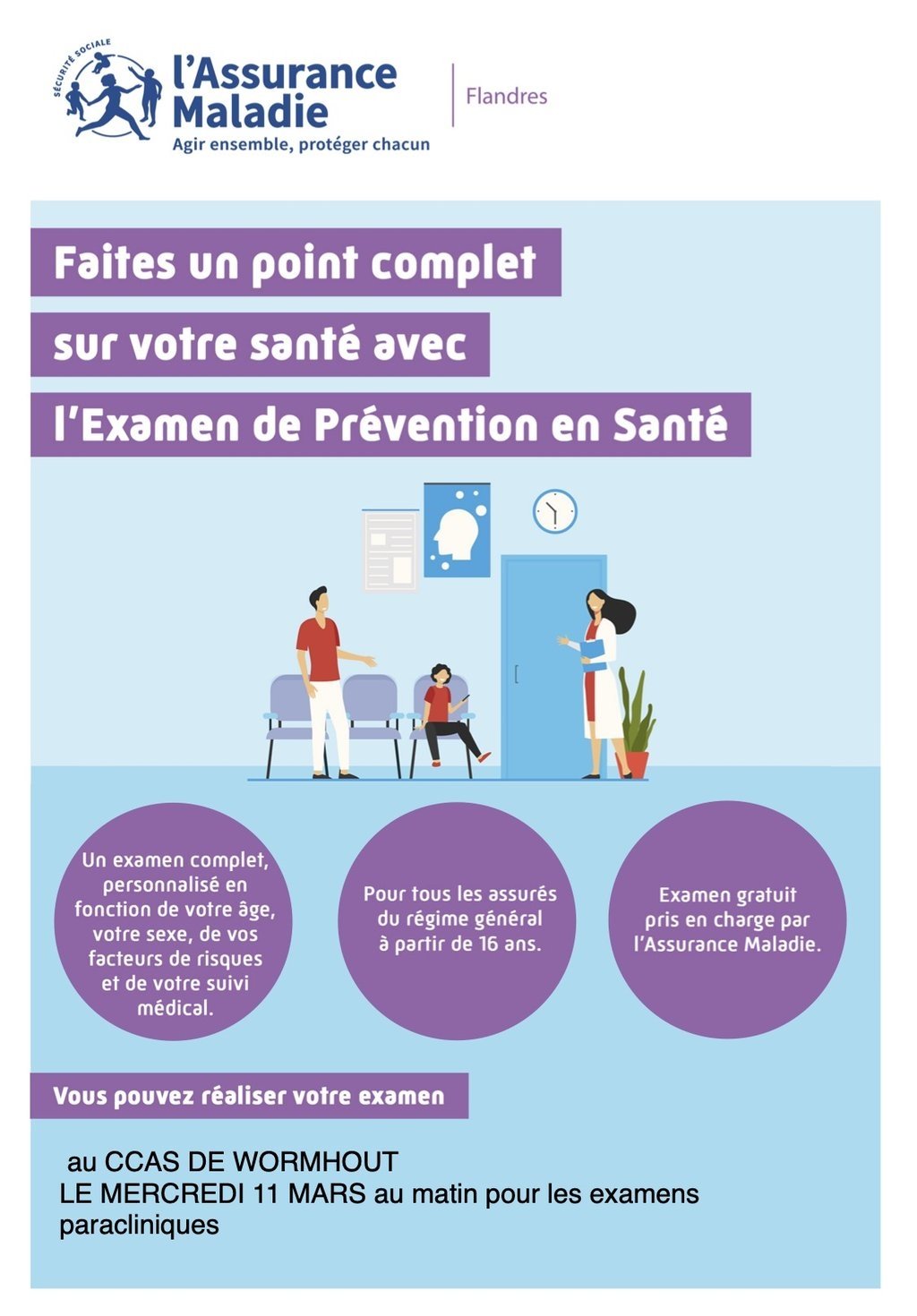 La Ville de Wormhout, en partenariat avec l’Assurance Maladie, vous informe de l’organisation d’un Examen de Prévention en Santé. Un bilan de santé gratuit, personnalisé selon votre âge, votre sexe, vos facteurs de risques et votre suivi médical. Il est ouvert à tous les assurés du régime général à partir de 16 ans et pris en charge à 100 % par l’Assurance Maladie.